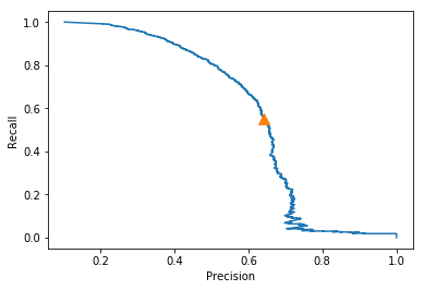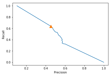 Below is the precision recall curve for the random forest classifier. We can see that it is more balanced that the previous two models. It has a higher precision that decision trees and a higher recall than both decision trees and kNN.