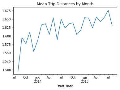 Trip distances show an overall increasing trend throughout the time period suggesting that the number of users is growing