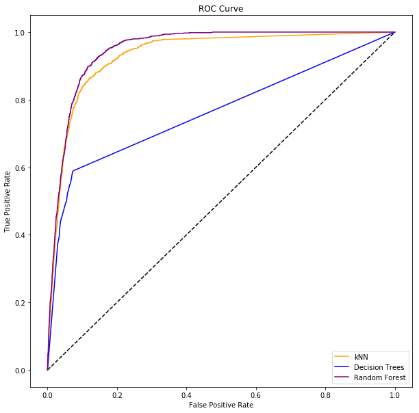 Based on the ROC curve, we can conclude that the Random Forest model is the best for our scenario. It covers the most area under the curve. kNN is not far behind either. Perhaps, if we want to reduce the number of False Positives, kNN is the better model.